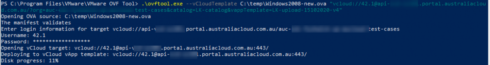 ovftool --vCloudTemplate C:\temp\Windows2008-new.ova "vcloud://123.1@api.xxx.portal.australiacloud.com.au:443?org=szxxx-xx-xx&catalog=LK-catalog&vappTemplate=LK-upload-15102020-v4"TIP: Make sure you use double quotes (") rather than single quotes ('). vCloudTemplate and vappTemplate flags are case sensitive.